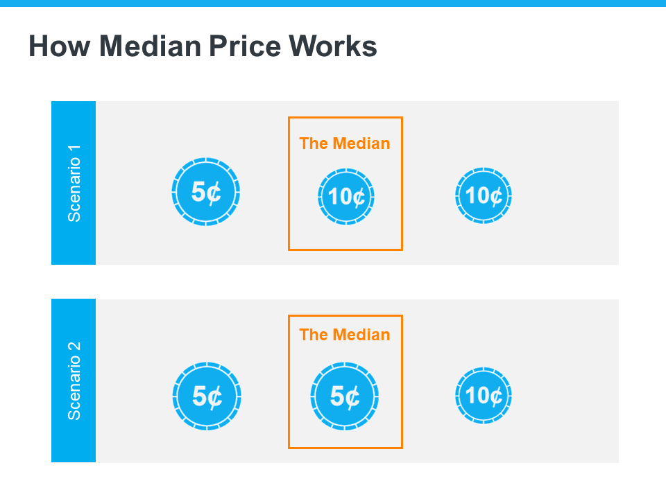 To drive this point home, here’s a simple explanation of median value (see visual below). Let’s say you have three coins in your pocket, and you decide to line them up according to their value from low to high. If you have one nickel and two dimes, the median value (the middle one) is 10 cents. If you have two nickels and one dime, the median value is now five cents.